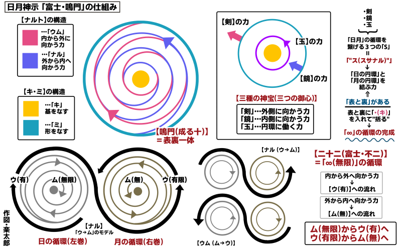 この「ウム」「ナル」という二つの流れは、「左巻(火垂・ひだり)の力」「右巻(水極・みぎり)の力」で現すことができ、それぞれ「ナミの神(+)」「ナギの神(−)」に対応してきます。