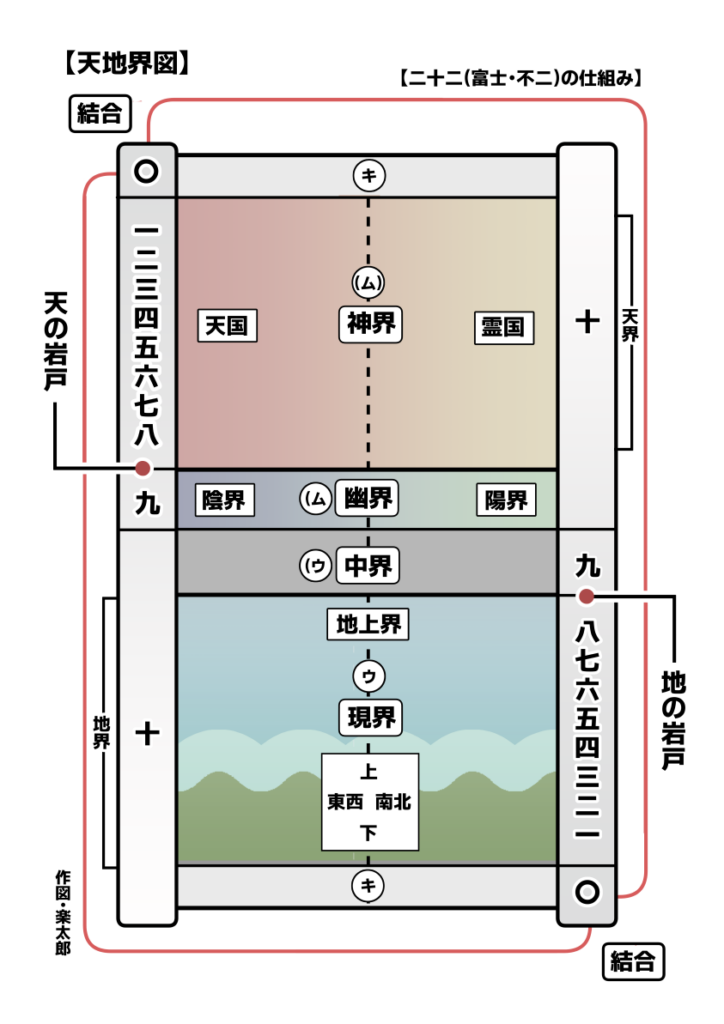 この時、神界から見て「八」は幽界と接する境界、現界から見て「中界」と接する境目にそれぞれ「天の岩戸」「地の岩戸」が存在すると考えられます。